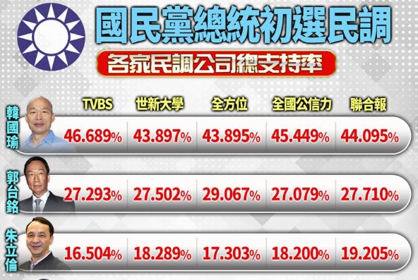 本社訊 / 國民黨總統初選七月十五日終於塵埃落定,高雄市長韓國瑜以近44.8%的支持率排名第一確定出線,將代表國民黨角逐2020年總統大位。