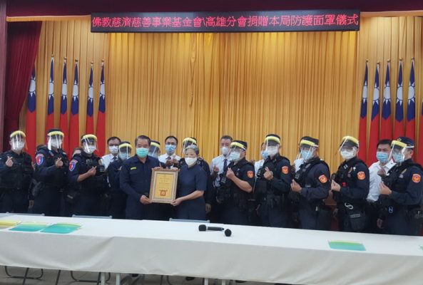 邱頡勝 / 新冠肺炎在全球蔓延,世界各國確診與死亡人數均節節升高,疫情日趨嚴峻,防疫工作刻不容緩,「佛教慈濟慈善事業基金會高雄分會」體恤高雄市政府警察局員警平時執勤辛勞與疫情之危險性,特召集分會志工趕製簡易式面罩一千枚供第一線員警執勤使用,於一日由分會志工林金貴等人代表分會送達警察局,由高雄市政府警察局由副局長王欽源代表受贈,並頒發感謝狀予該分會表揚義行。