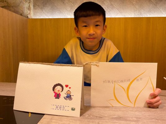 圖說二:孫翊倫獲知自己榮獲2020總統教育獎,在慈濟基金會執辦協助寫卡片,希望頒獎當日能見到前總統府秘書長「花媽」陳菊。