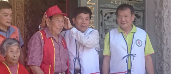 圖:中油高雄廠廠長楊進國為長輩戴帽祈福與公關組經理顏清瑞及長輩合影。
