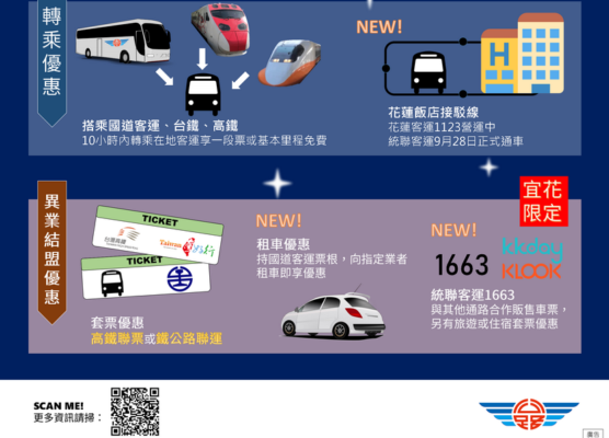 邱頡勝 / 公路總局將在中秋及國慶連續假期實施多項票價優惠措施,搭乘國道客運享票價85折或平日票價優惠、全票者持電子票證乘坐「台灣好行」路線享半價優惠,或於乘坐國道客運、高鐵或火車後「刷卡轉乘」當地客運有基本里程22元(或一段票)的免費優惠,及搭乘北花線相關異業結盟優惠,就是要鼓勵民眾多加利用大眾運輸工具。