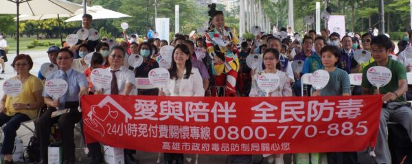 與會的有教育部鄭文瑤專委、法務部朱念慈科長、衛福部食藥署李建德專員、高檢署高雄分署張金塗主任檢察官、高雄地檢署林俊傑主任檢察官、法制局王世芳局長、警察局王欽源副局長、藥師公會施坤鎮、蔡明聰理事長、醫師公會張榮洲副理事長、吳宗慶理事、慈濟大學、崇華基金會、環境教育協會、張老師基金會、里長主席黃崑光率在地里長、王朝旺區長、社會局、衛生局、勞工局、青年局、教育局代表等人,與現場民眾高舉反毒宣誓卡,齊聲宣誓「我反毒、我驕傲」。