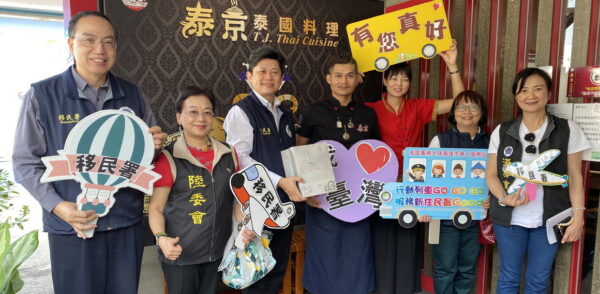 圖二:移民署行動列車偕同陸委會、海基會在泰國籍張明雄夫妻自營的泰國特色餐廳合照。