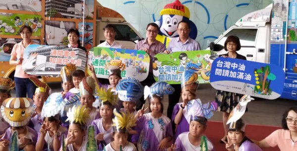 交車典禮上,中油寶寶搭配故事媽媽及汕尾國小師生表演「倒立水母小非找朋友」故事劇,生動地介紹林園海洋濕地公園水母湖,及汕尾的方塊海及月牙灣夕照;表演的小朋友一齊開心地喊著「台灣中油、閱讀加滿油;通閱書車、知識任遨遊」的口號,迎接這2台畫滿童趣、滿載知識的書車。