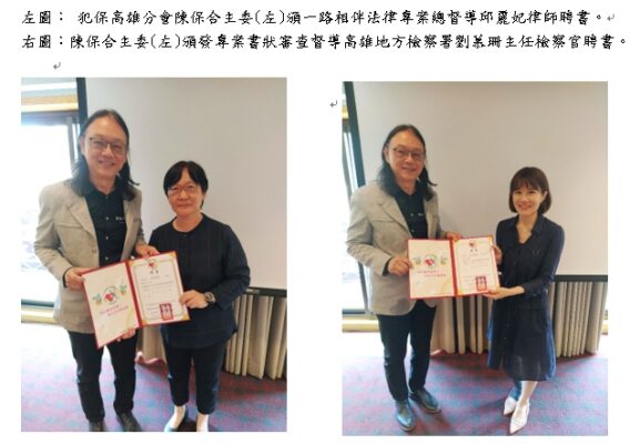 左圖:犯保高雄分會陳保合主委(左)頒一路相伴法律專案總督導邱麗妃律師聘書,右圖:陳保合主委(左)頒發專案書狀審查督導高雄地方檢察署劉慕珊主任檢察官聘書。