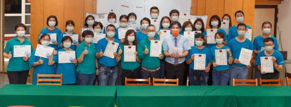 圖二:臺中市啟聰學校校長王敬儒(中)與台灣無毒世界協會全體志工合照。