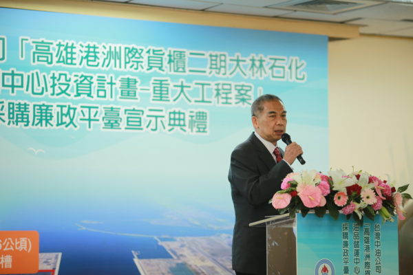董事長李順欽致詞表示,大林石化油品儲運中心位於高雄市小港區之填築新生地上,總計畫預算達新臺幣768億元,預計117年完工,將成為臨港型之輸儲中心,台灣中油從此將轉型成為亞洲區域石化原料與產品之供需調節、物流集散與貿易流通之市場領導者。這項重點投資計畫將開設採購廉政平臺,於公司官網建立「採購廉政平臺專區」,提供外部監督採購及工程施作過程並建立聯繫溝通機制,適時邀集檢察、廉政、調查、台灣透明組織、工程會及廠商等公私部門溝通相關議題,凝聚共識,針對潛在的風險及爭議即時因應,保障重大採購工程案進度與品質。