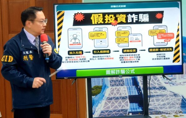 圖1:市警局長林炎田指「網路社群平台廣告,要小心」、「派員面交投資現金,攏是騙」,提醒市民網路投資陷阱多,切勿輕信來路不明的投資訊息。