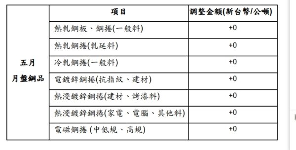中鋼公司一一四年五月份月盤調幅詳下表。