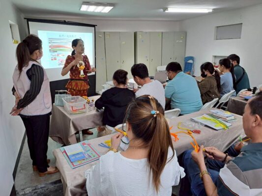 課程也安排學員手作花環飾品,利用簡單的材料,透過徐閤芸的指導與示範,讓參與的新住民夫妻發揮巧思與創意,編織出豐富色彩的花環飾品,讓每位學員感受不一樣的柬國文化。
